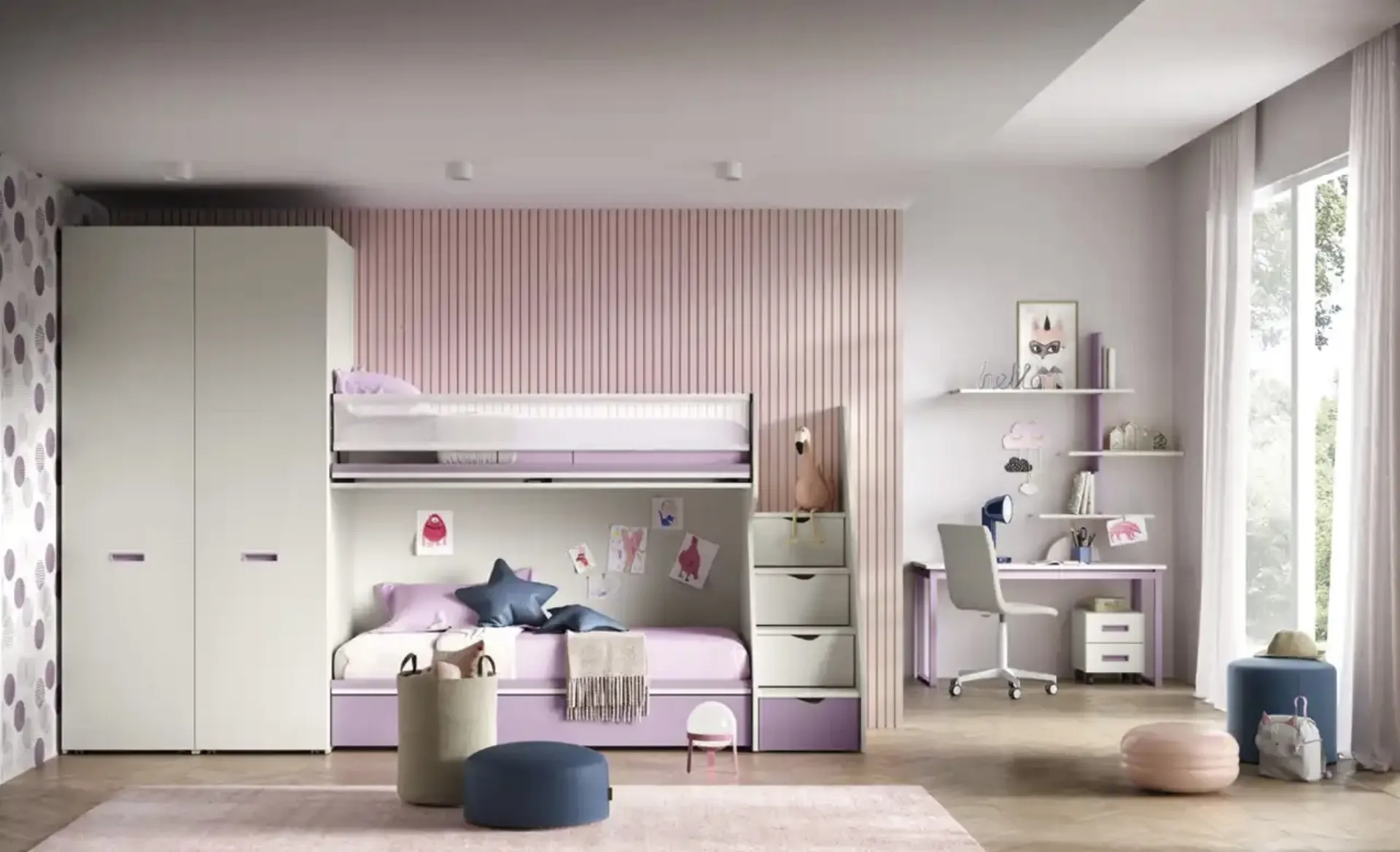 Con la Cameretta K103 di Moretti Compact Camerette renderai la stanza dei tuoi figli uno spazio davvero funzionale e sicuro, che li seguirà mentre diventano grandi. Farci visita vuol dire vedere dal vivo tutte le più belle soluzioni per bambine a soppalco in melaminico che proponiamo nel nostro showroom. Questa soluzione con finitura in melaminico, tra quelle a soppalco per bambine di Moretti Compact Camerette, accontenta le necessità degli adulti e i gusti dei giovani. Per decorare alla perfezione le Camerette, Moretti Compact Camerette presenta progetti articolati e polifunzionali: sono numerose le attività che i tuoi bambini portano a termine lì.