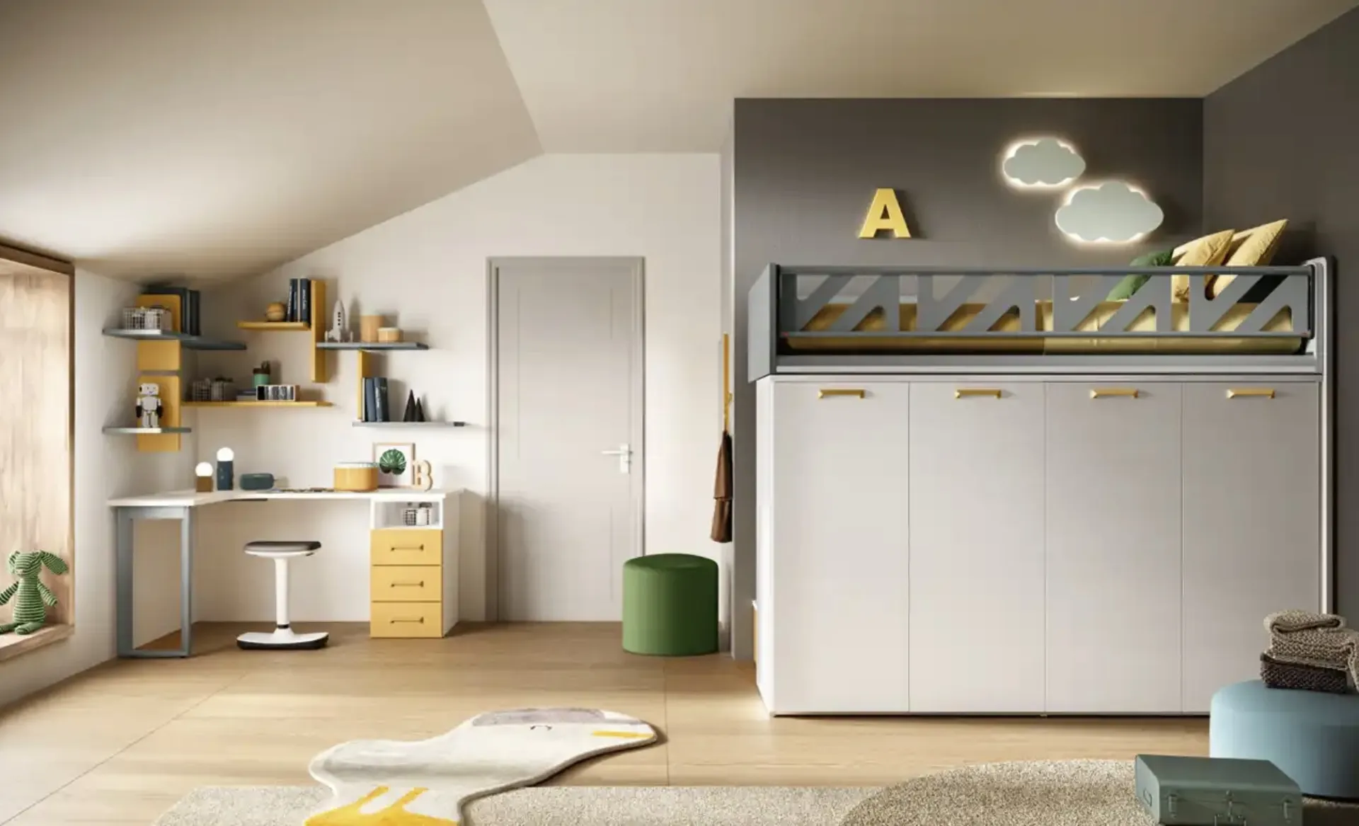 Nell'arredamento della stanza dei bambini affidati a noi: nel nostro punto vendita proponiamo tutte le più belle composizioni arredative moderne per la loro camera. Questa soluzione in melaminico ultima al meglio le qualità pratiche e il valore estetico della camaretta, poiché è capace di unire funzionalità ed ergonomia. Moretti Compact Camerette dispone di una ricca gamma di elementi accessori da comporre su misura: troverai letto, armadio o cabina armadio, tavolo da lavoro, sedie e librerie. Se cerchi idee creative per decorare al meglio la stanza dei tuoi bambini, ti proponiamo la Cameretta K109 di Moretti Compact Camerette con finitura in melaminico.